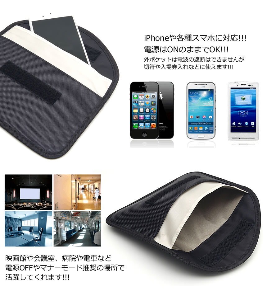 ■商品説明 iPhoneなど携帯を入れるだけで Wi-FiやBLUETOUTHなどスマートフォンの 様々な通信機能も遮断できるポーチ iPhoneや各種スマホに対応!!!電源はONのままでOK!!! 外ポケットは電波の遮断はできませんが、 切符や入場券入れなどに使えます!!! 会議中や病院内、電車内など急な着信などで 周りに迷惑が掛からずとっても便利です♪