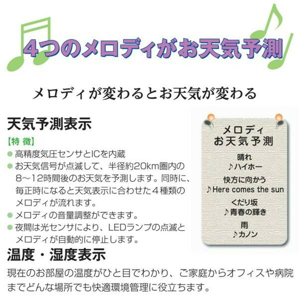 サイズ直径約320×58mm個装サイズ:35×35×8cm重量個装重量:1600g素材・材質天然木枠仕様掛型使用電源:単3乾電池×4機能:天気予測、メロディ、温度計、湿度計、時計付属品単3乾電池×4、取扱説明書、保証書(保証期間:1年間)製造国日本おしゃれな我が家の気象台♪